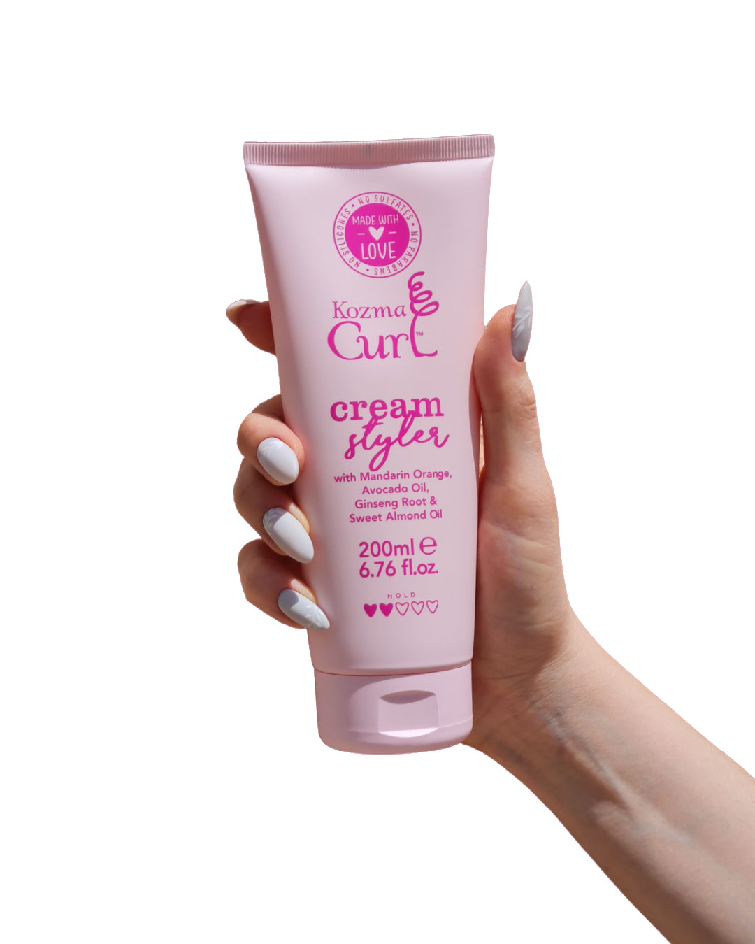Kozma Curl Cream Styler is sure to be your next fav curly hair product! This cream styler is a hybrid of moisture and light weight hold. Enjoy shiny, soft, defined curls with results that last. Natural active ingredients help rejuvenate and nourish curls, encourage elasticity, and combat environmental stresses with antioxidants. Does not contain silicone, sulfate, paraben